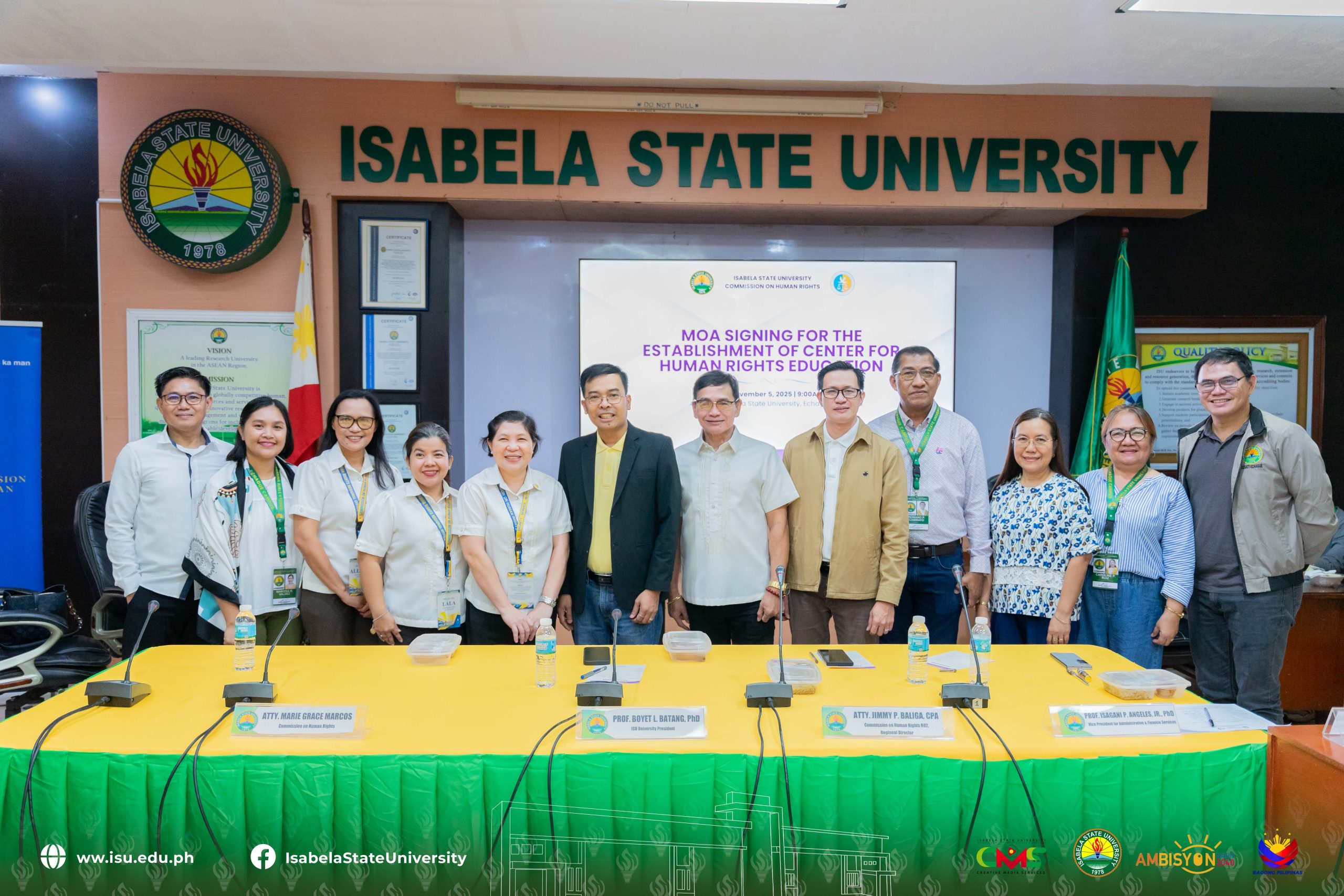 Isabela State University (ISU) and the Commission on Human Rights Region II (CHR R02) formally signed a Memorandum of Agreement (MOA) for the establishment of the Center for Human Rights Education (CHRE) on November 5, 2025 at the Alba Hall, ISU Echague Campus.