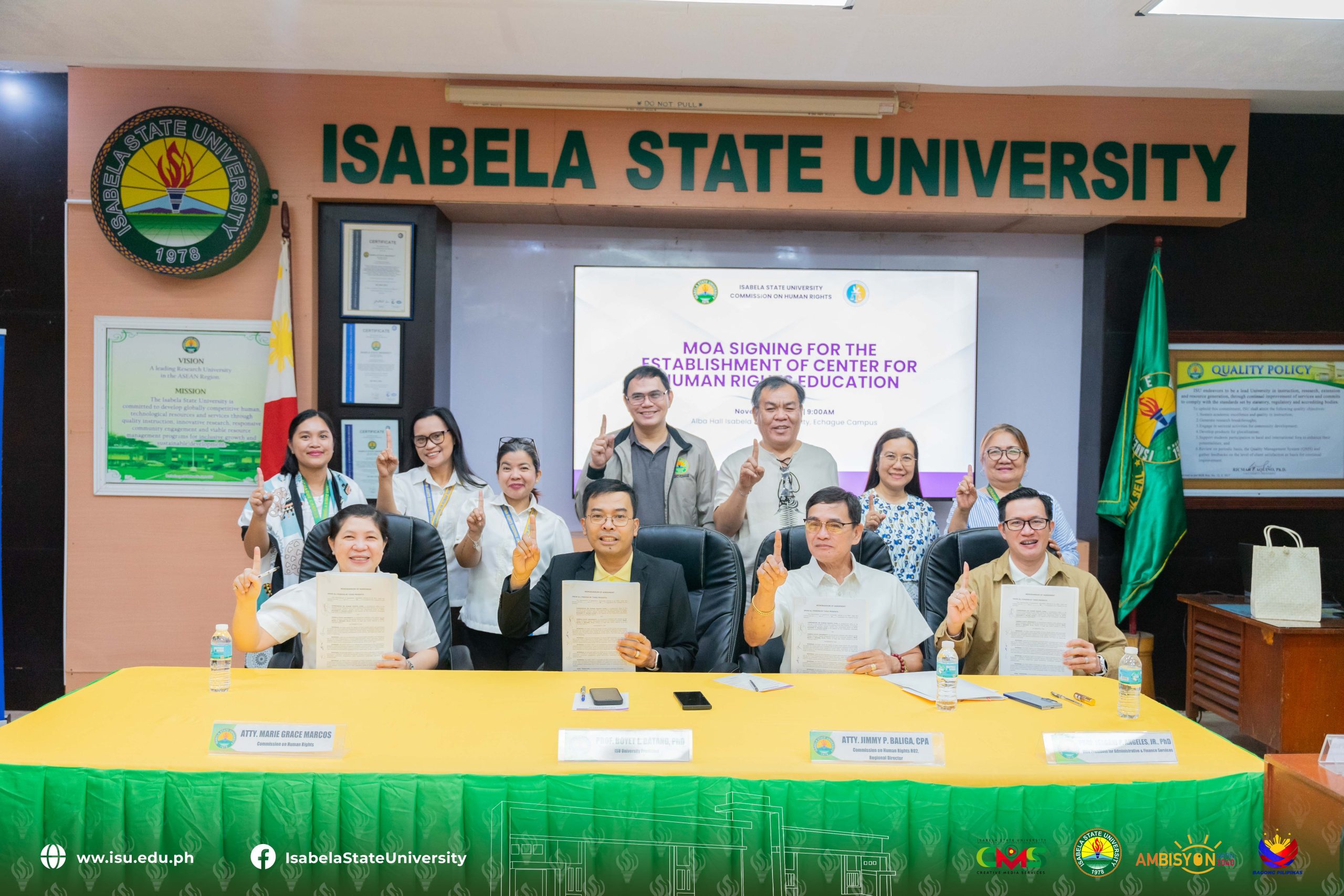 Isabela State University (ISU) and the Commission on Human Rights Region II (CHR R02) formally signed a Memorandum of Agreement (MOA) for the establishment of the Center for Human Rights Education (CHRE) on November 5, 2025 at the Alba Hall, ISU Echague Campus.