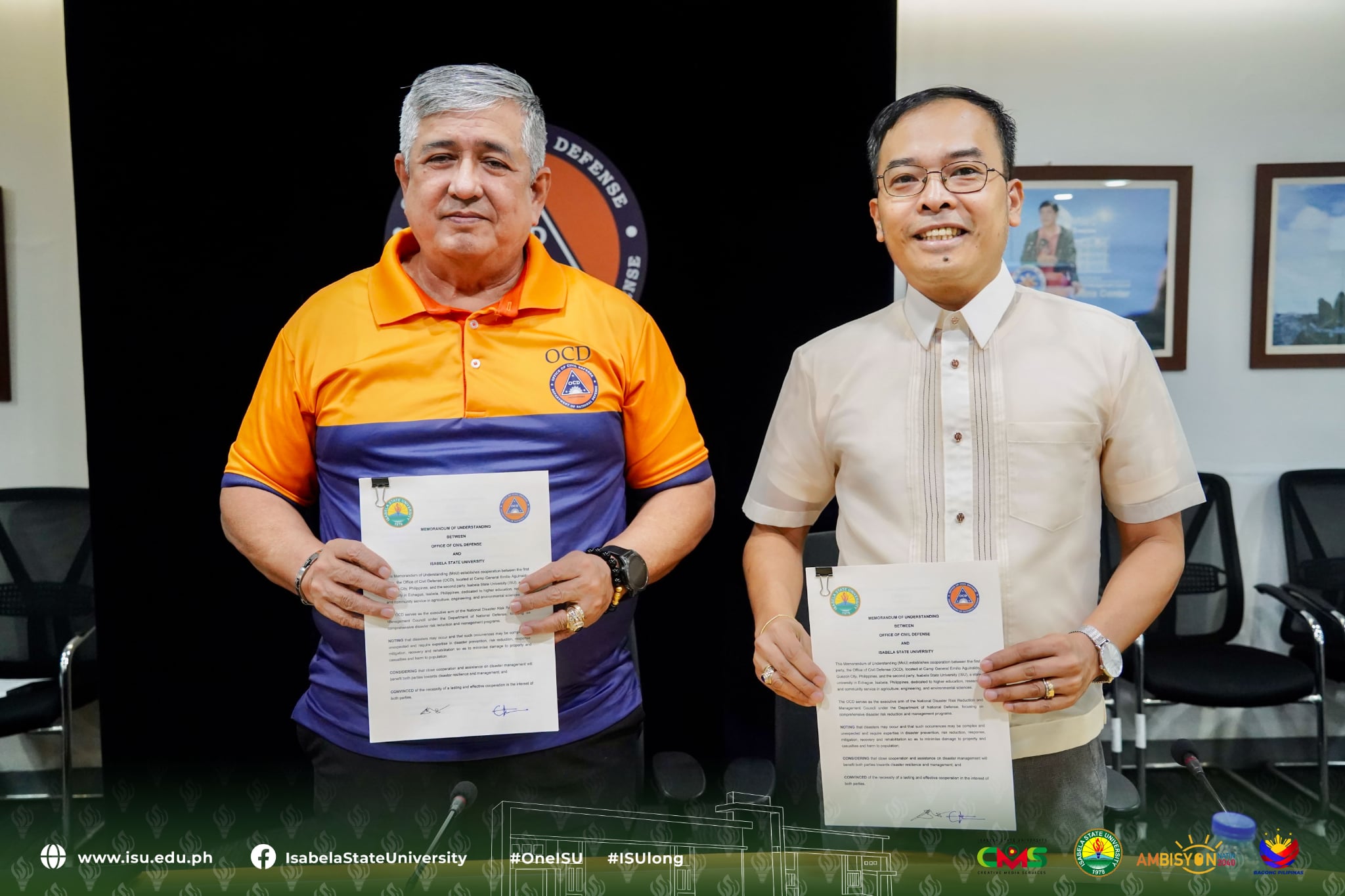 The MOU establishes cooperation between ISU, through its mandate of providing higher education, research, and community service in agriculture, engineering, and environmental sciences, and the OCD, for its responsibility to coordinate disaster management efforts in the Philippines.
