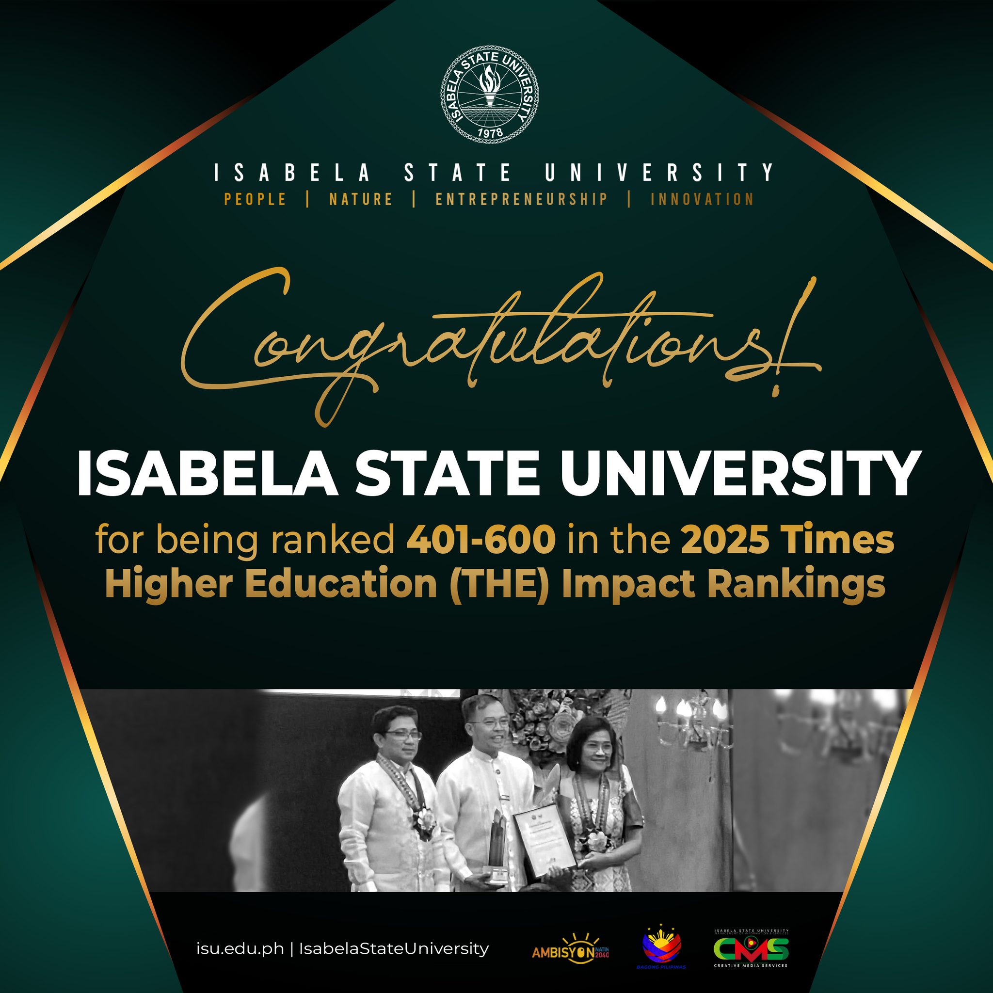 Isabela State University (ISU) has received three awards at the Internationalization Champions of Nation-building and Sustainability (ICONS) Awards 2025, an annual ceremony of the Commission on Higher Education (CHED) that recognizes Higher Education Institutions (HEIs) for their significant contributions to the internationalization of Philippine higher education.