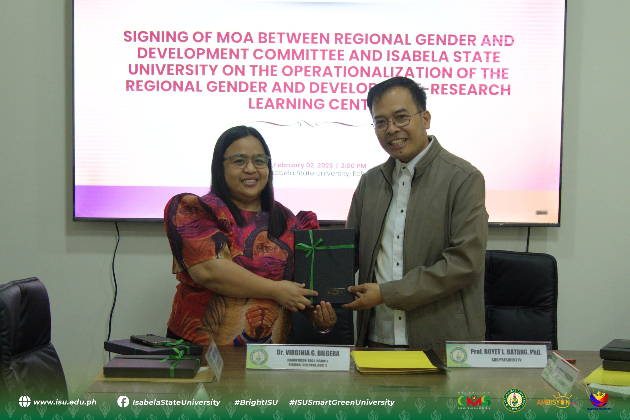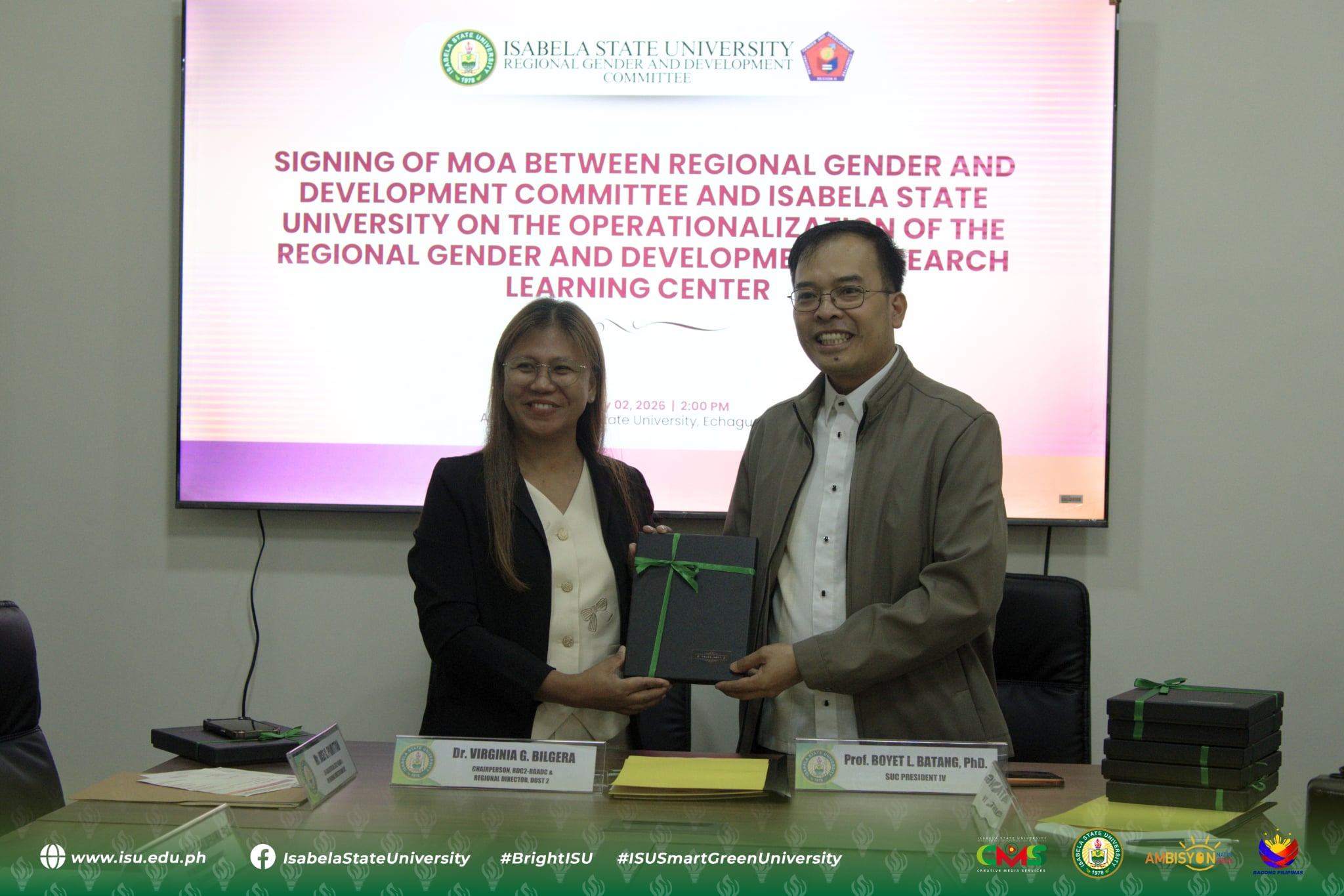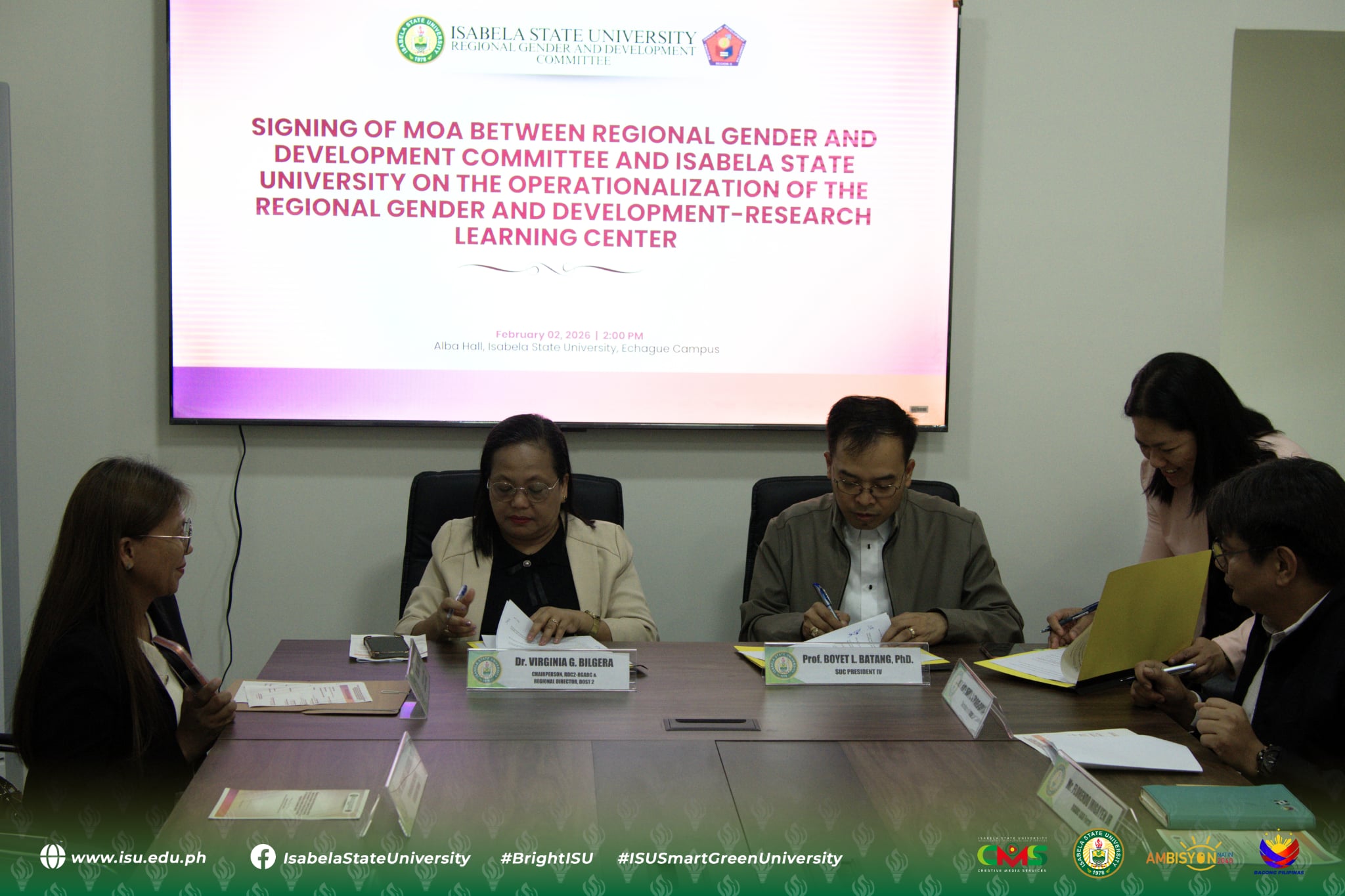 Isabela State University (ISU) formalized its partnership with the Regional Gender and Development Committee (RGADC) through the signing of a Memorandum of Agreement (MOA) on the operationalization of the Regional Gender and Development–Research Learning Center (RGAD-RLC) on February 2, 2026 at the Alba Hall, ISU Echague Campus.