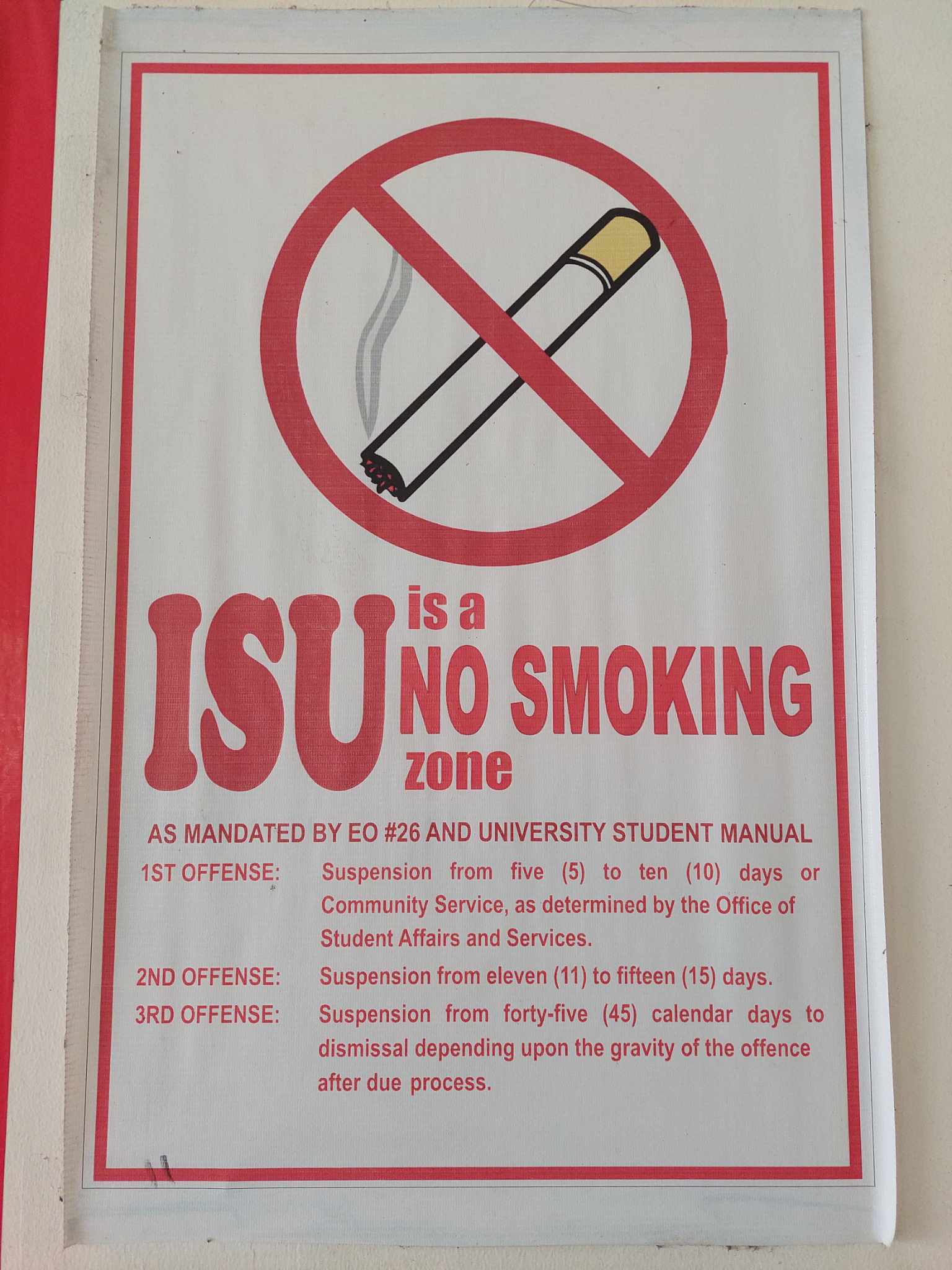 The Isabela State University (ISU) reiterates Memorandum Circular no. 17, 2009 of the Civil Service Commission on adoption and promulgation of the 100% Smoke Free Policy and the Smoking Prohibition in all areas of government premises, buildings, and grounds in order to ensure a healthy and productive workforce as reinforced by Executive Order No. 25.